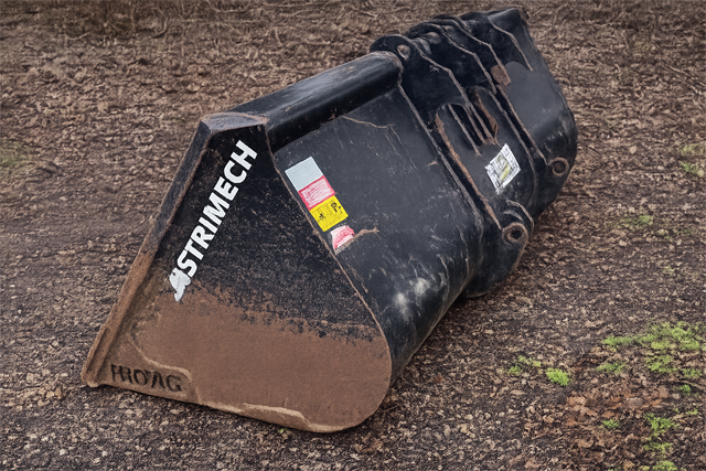 Strimech Bucket – BKT15-76 Genuine Strimech Engineering Ltd heavy-duty agricultural/loader bucket in used condition.