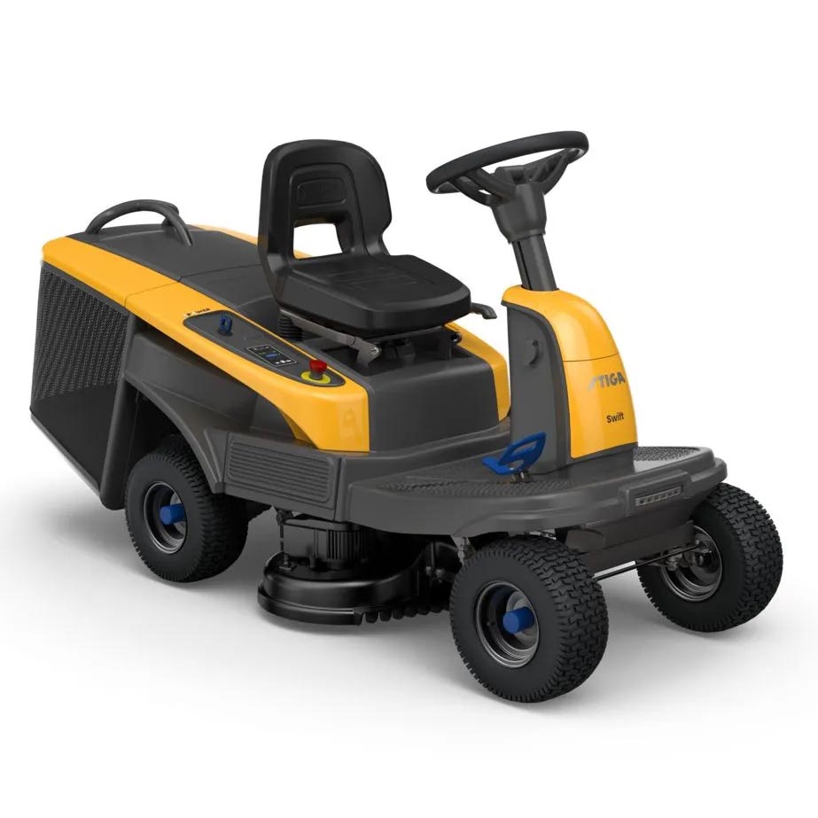 The Stiga Swift 372e is a compact and agile ride-on mower, perfect for navigating tight spaces and intricate gardens. Powered by 48V shareable ePower batteries, it can efficiently care for lawns up to 3000 m² on a single charge. The mower's twin-blade cutter deck and aerodynamic collecting funnel ensure excellent mowing and grass collection.