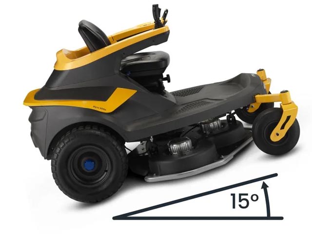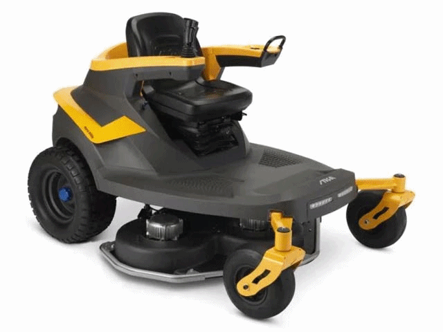 The STIGA Gyro 900e is equipped with a 125 cm cutting deck featuring three freely rotating blades, each powered by a 1.5 kW motor. It offers a top ground speed of up to 13 km/h and can cover up to 13,000 sqm on a single charge, with a runtime of up to 150 minutes. The mower includes STIGA Smart Cutting and Driving Modes, allowing users to select from three blade speed settings (2800 to 3200 rpm) and three driving modes (4 km/h to 13 km/h). The cutting deck can be adjusted to eight positions via a button on the dashboard. The Gyro 900e features dual independent electric transmissions, providing a 360° turning radius for precise navigation. It also has a low center of gravity (55.3 cm) for stability on slopes up to 15°. The mower is designed with a high-back support seat, dual parallel suspension system, and intuitive controls for enhanced comfort and safety. Additionally, it includes a weatherproof seat and a wide footboard for unobstructed access